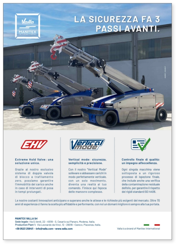 Attualmente parte della multinazionale Tadano, e in precedenza di Manitex, Valla progetta e produce gru industriali semoventi elettriche. As.u.ar. si occupa di tutta la corporate image, con un servizio “in house” e una costante presenza in azienda. Tutte le attività di comunicazione sono create e firmate in esclusiva da noi che grazie a questa partnership, possiamo entrare nel dettaglio delle strategie di comunicazione e in tutte le attività promozionali.